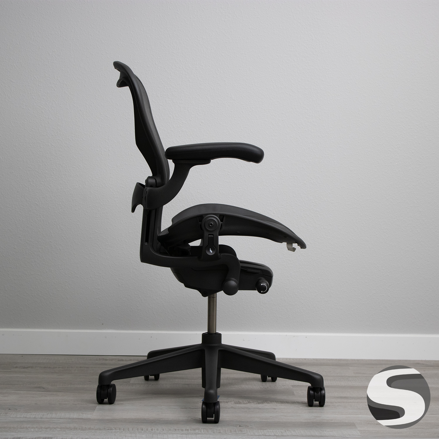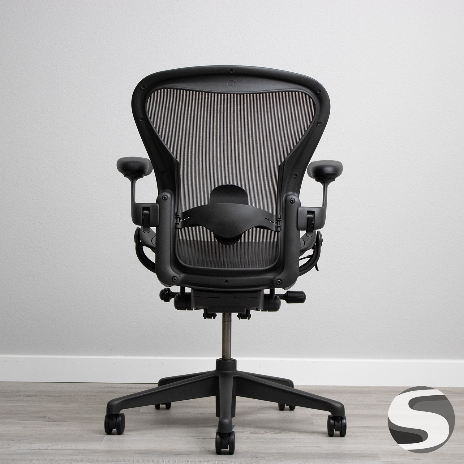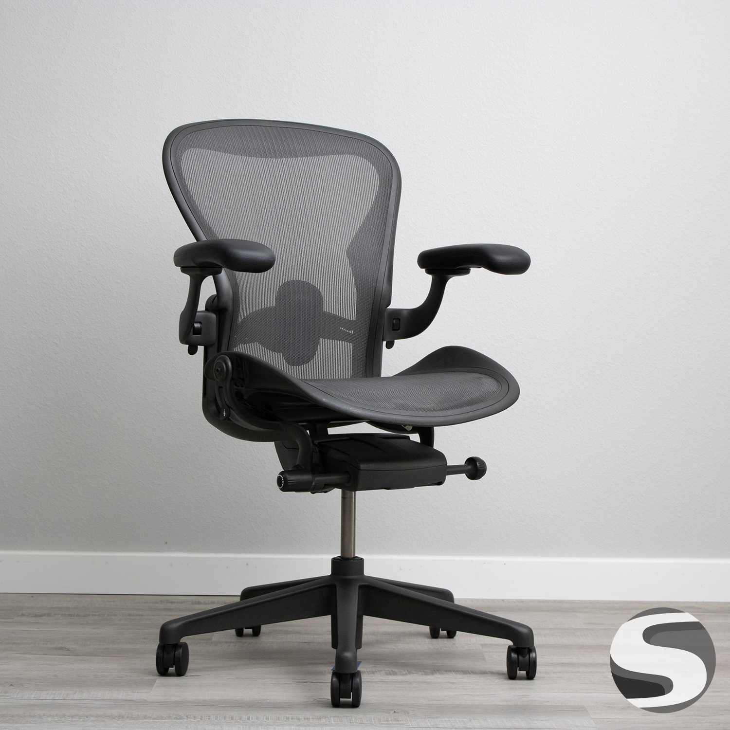 The updated Aeron chair by Herman Miller is ergonomic and designed for a wide range of body types. This is the medium version, also known as size B, with tab adjustable with posturefit and includes all available features. The Posturefit differs from the lumbar version of the Aeron by giving better flexibility with it’s support, whereas the Lumbar version is more rigid and gives better lower back support. This is the newest version of the Aeron. The Remastered Aeron has different height ranges, and the weight capacity has increased to 350 lbs. This version offers the groundbreaking Pellicle suspension material, which encourages an ideal sitting position – with an open chest, shoulders pulled back, and a slightly forward-tilted pelvis. Find out why everyone is raving about this chair at a price you can afford.