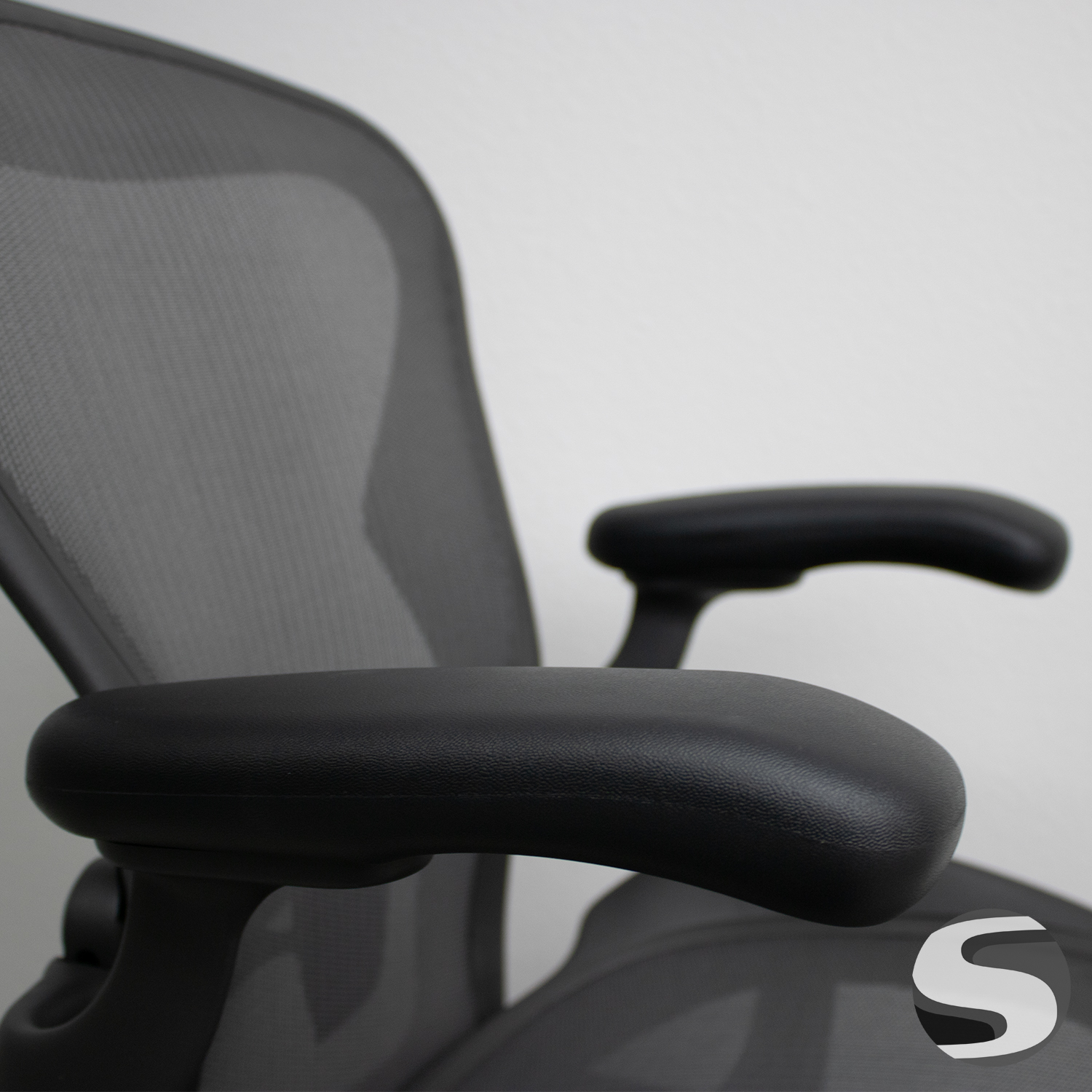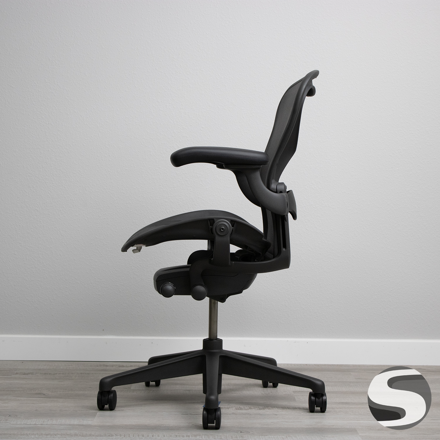 Refurbished/Renewed Herman Miller Remastered Aeron Office Chair in Graphite with Lumbar in Size B. Missing forward tilt.