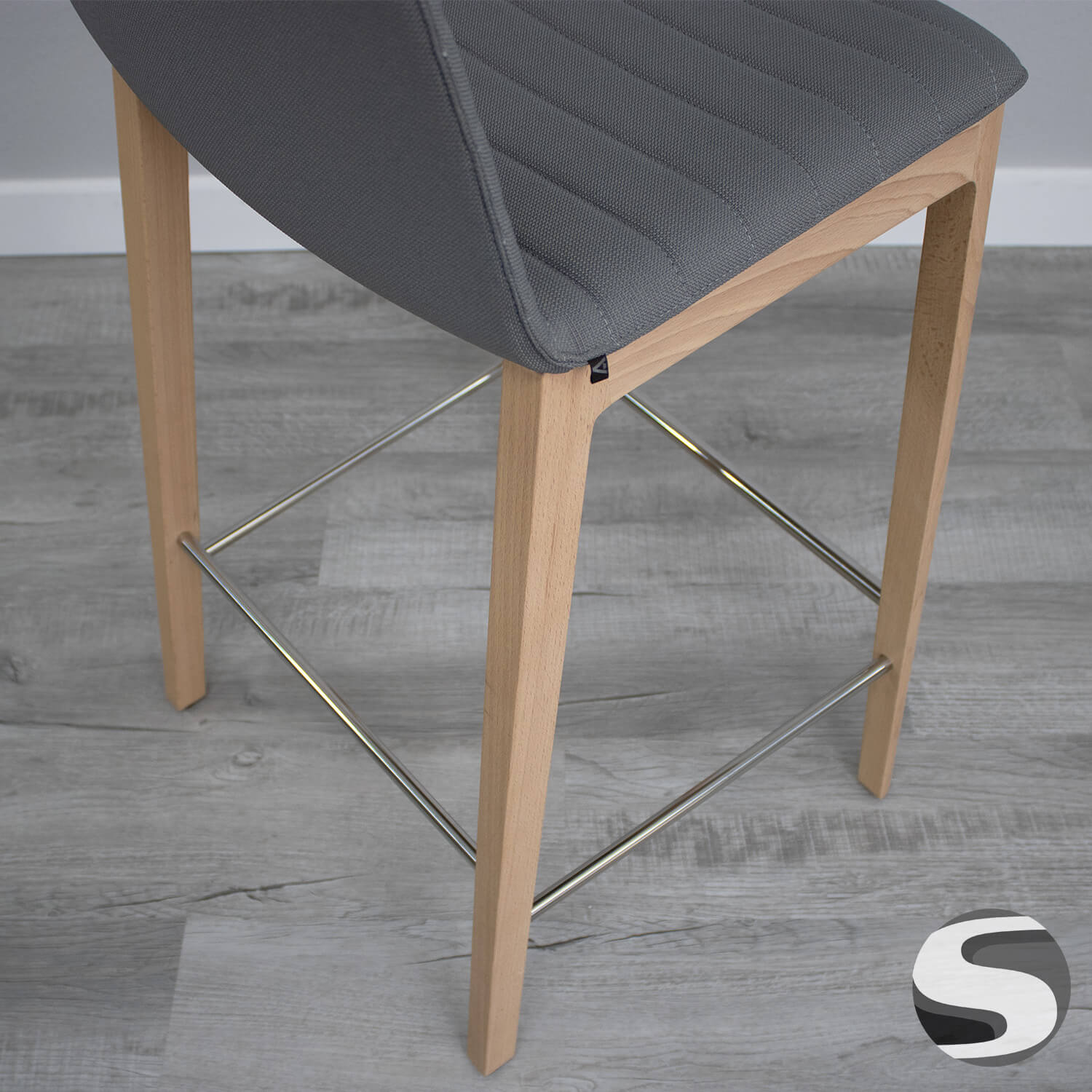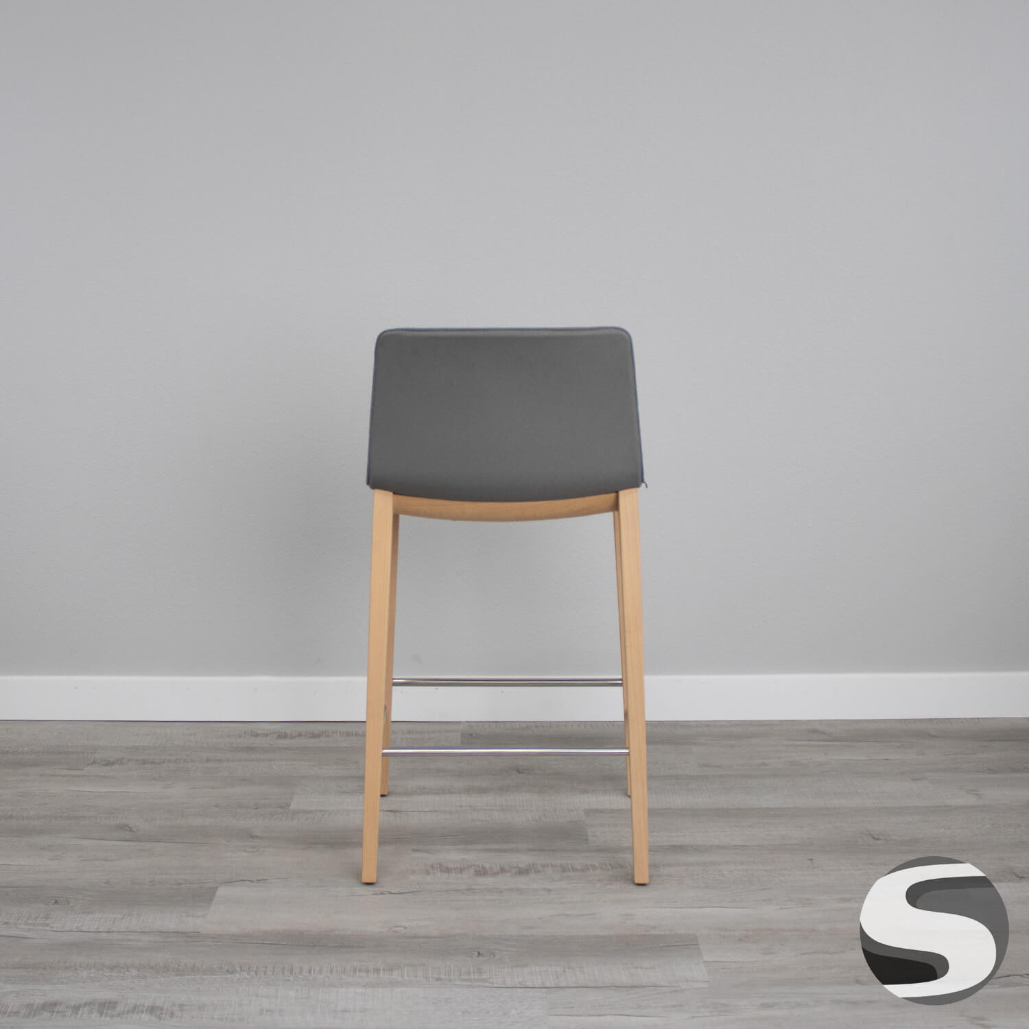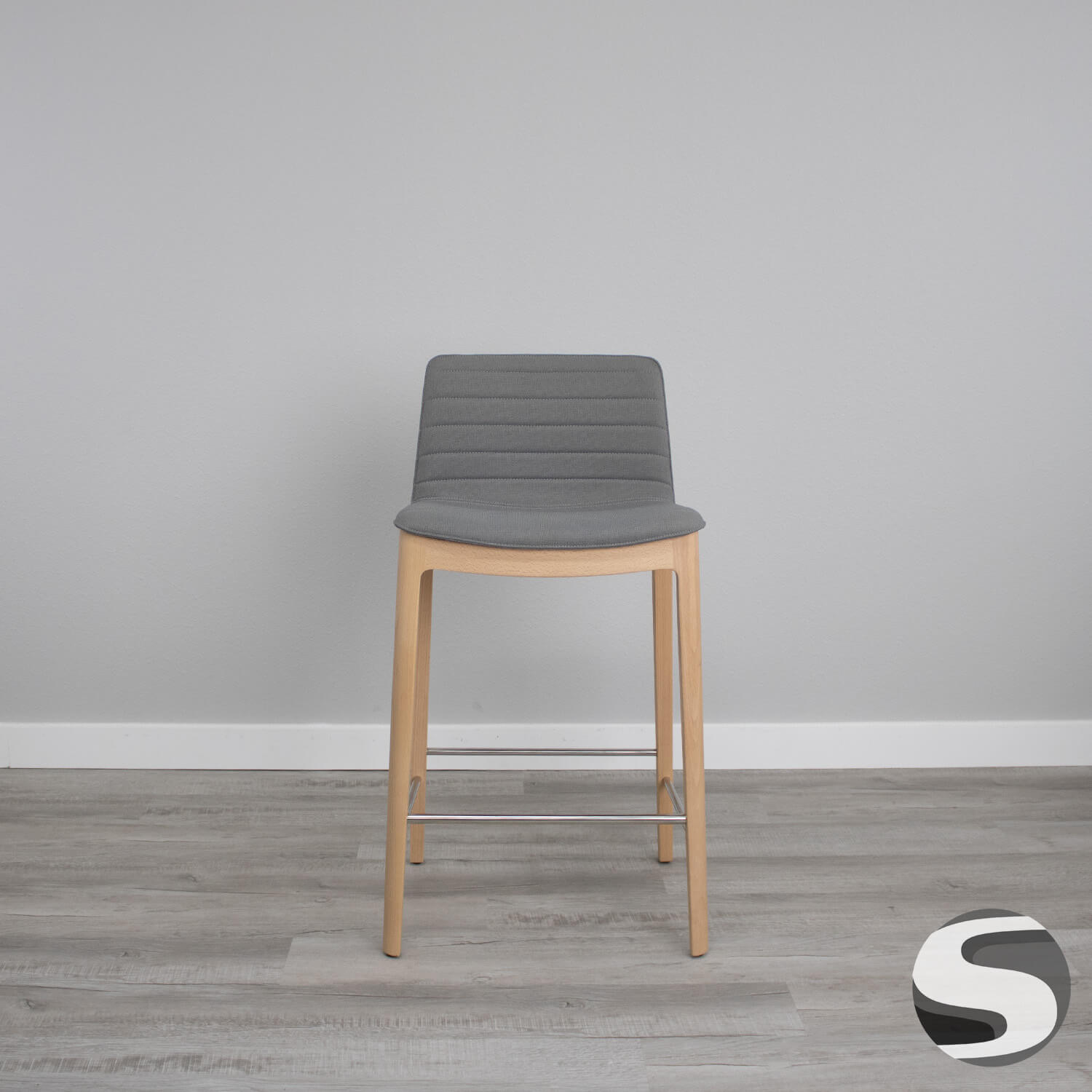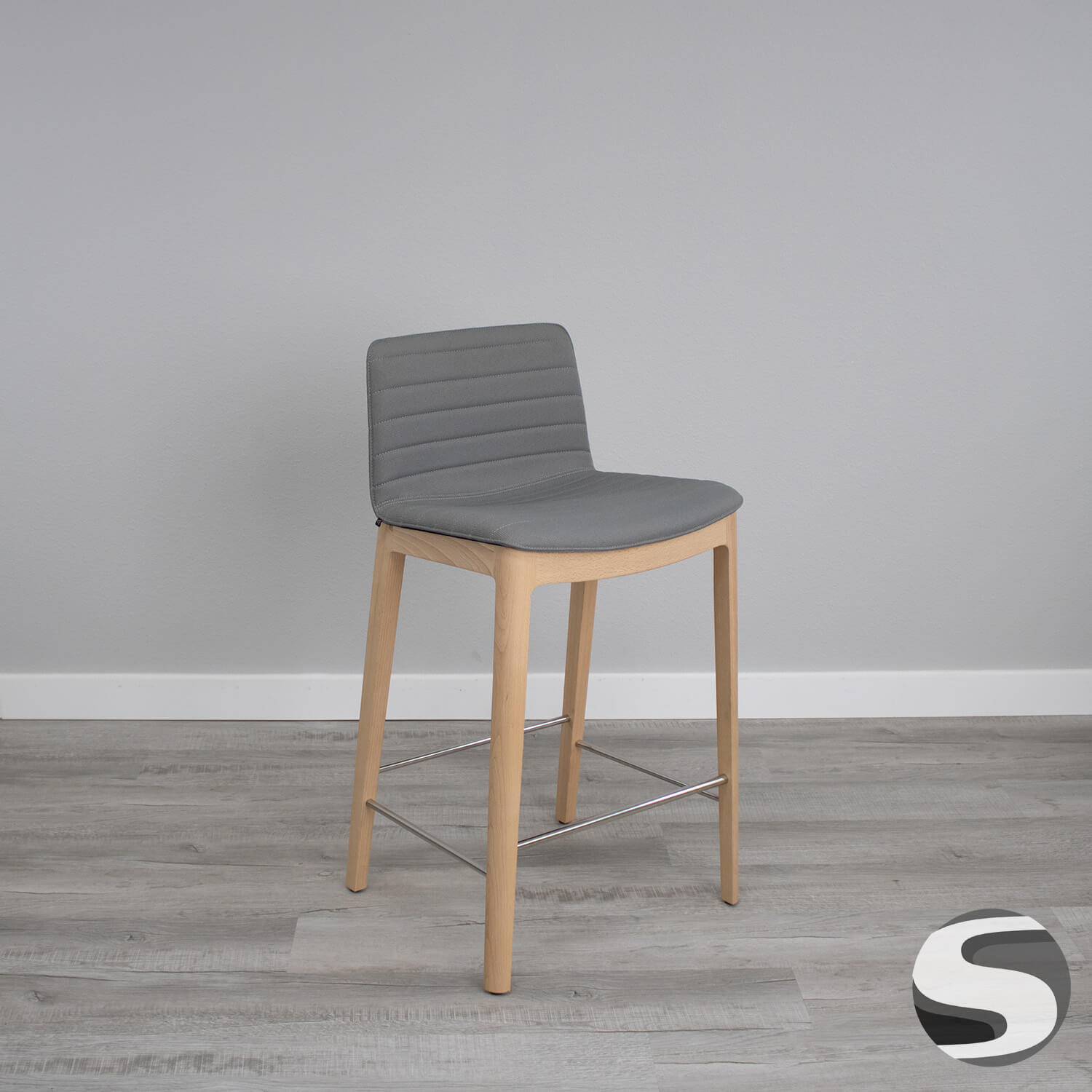 Andreu World Mid Back Bar Stool Gray Fabric Upholstery and Beechwood Base. Excellent condition.