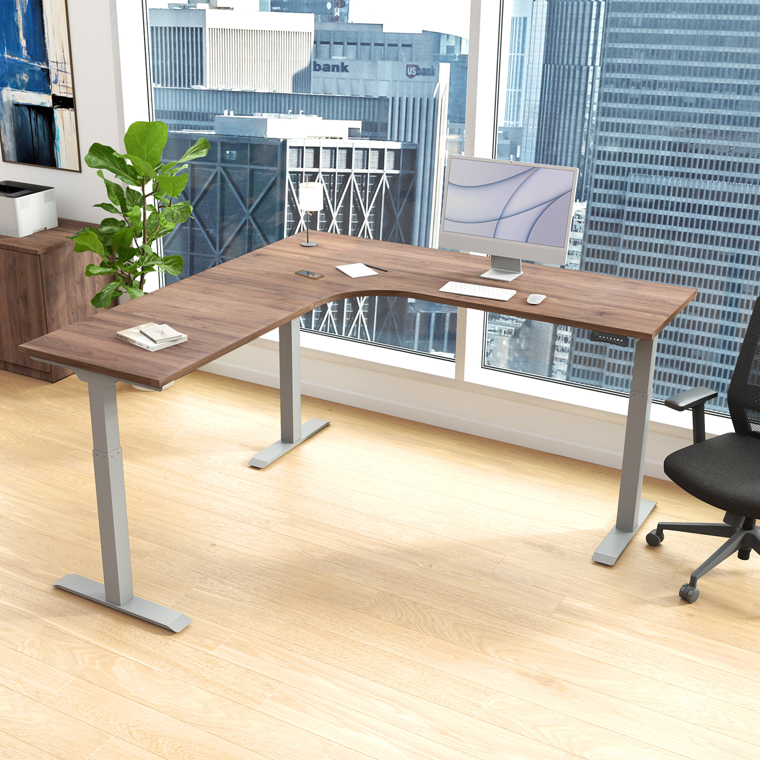 The i5 Industries iRize Corner Standing Desk features an ultra quiet dual motor system with a two column design that rivals top brands in quality. The inner corner is rounded for accessibility with flexible monitor placement. Kai laminate top is one inch thick and has fluting on the edges for a high quality look and feel, available in six beautiful finish options. It is also fully reversible, able to be used as a left or right-handed desk. Create an ergonomic space in your existing office by enhancing cubicles, workstations, or integrate it with Kai desking or storage options to furnish your whole office space. When in motion, iRize height adjustable bases have fast, stable adjustments for up to 330 pounds thanks to its heavy duty steel construction. Enhance your workspace with heights adjusting from 27.2″ to 46.5″ tall to accommodate a wide height range of individuals. Enjoy seamless transition between sitting and standing to gain a better flow throughout your workday and increase productivity.