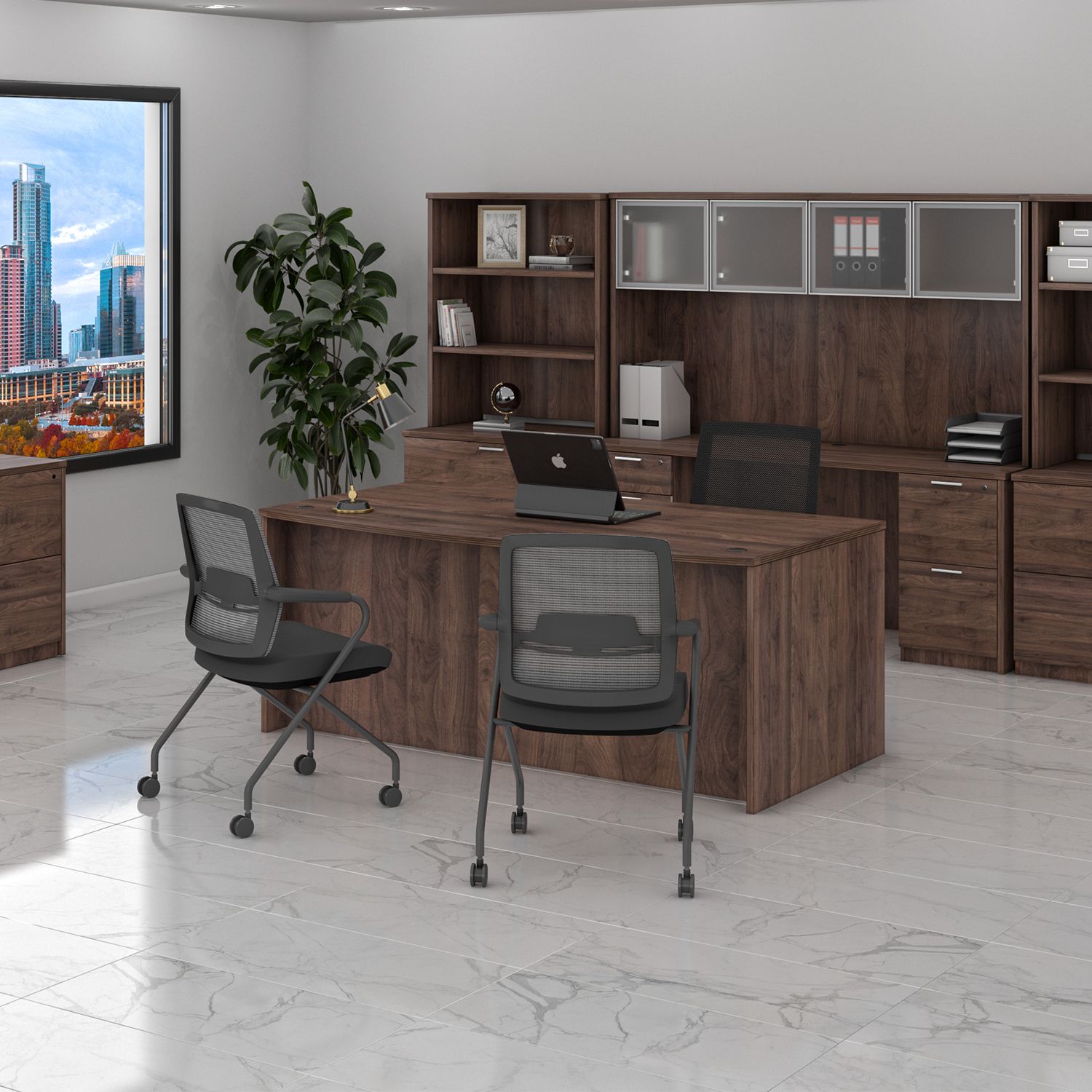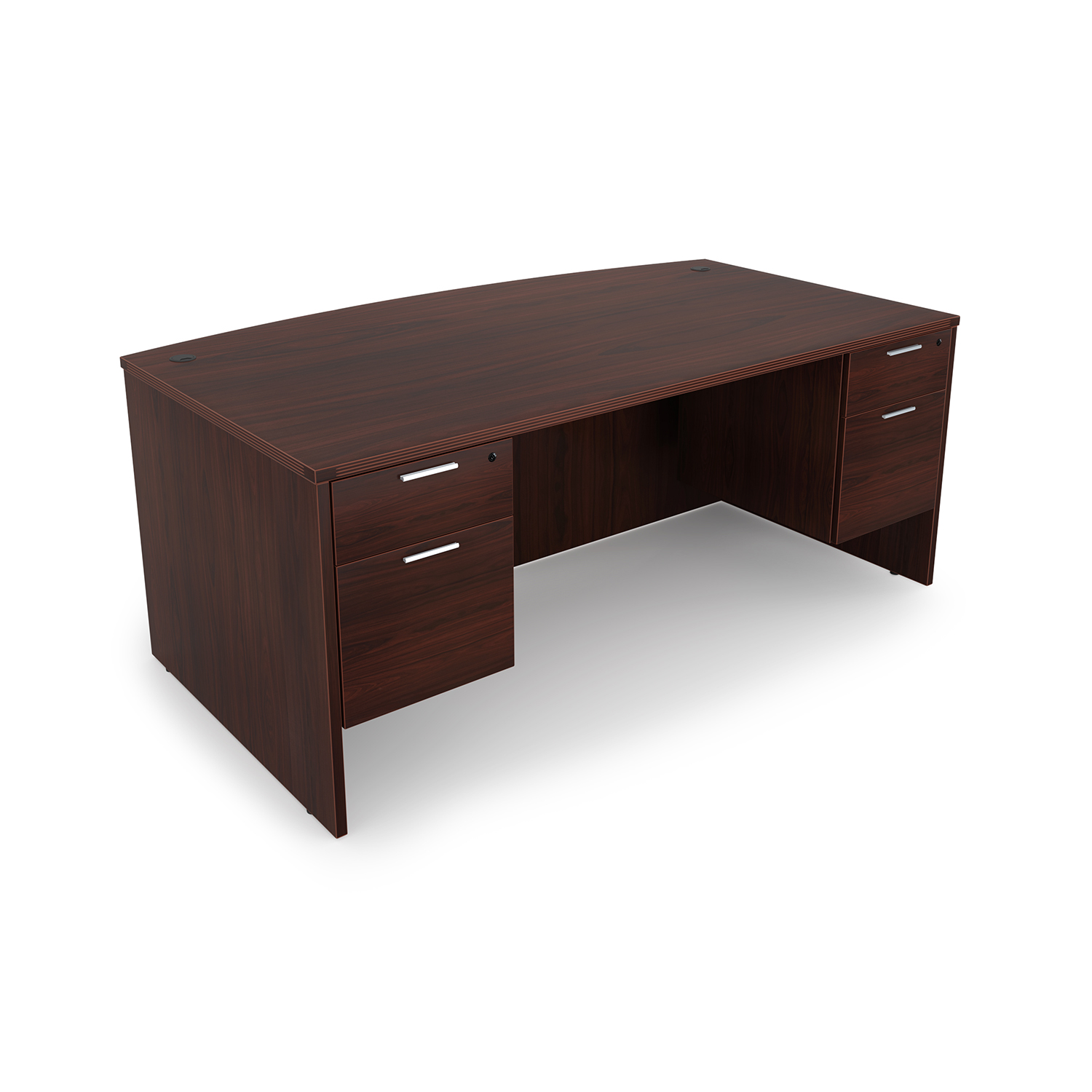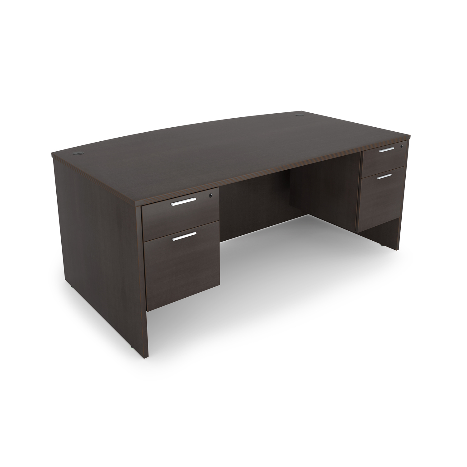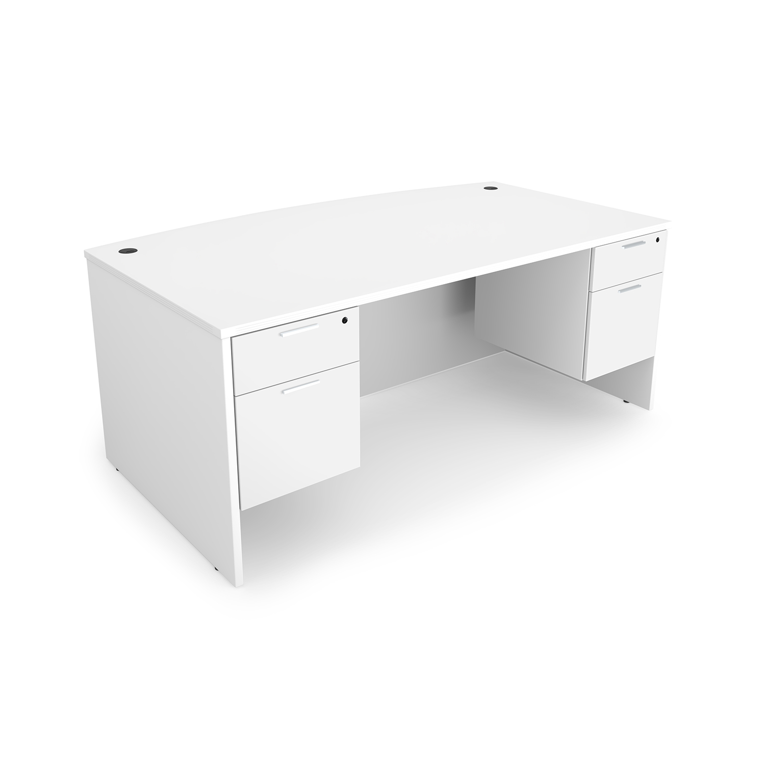 Kai Executive Bow Front Double Pedestal Desk features two hanging drawers on each side that are lockable. Ideal for commercial interiors, private offices, executive spaces, government offices, and home offices. A sleek, modern design with fluted top edging for a more professional presence in any room. Perfect for spreading out and staying productive, the top offers ample room for multiple monitors. Combines strength, beauty, and durability to any space.