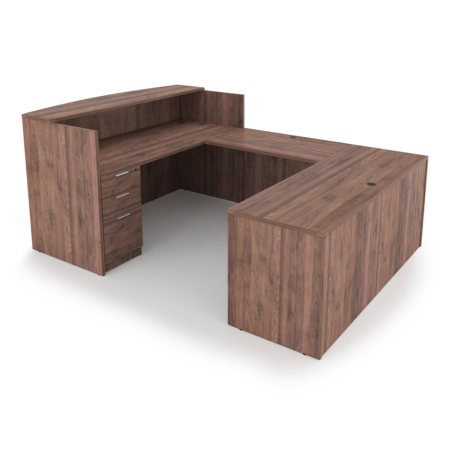 The i5 Industries Kai Modern U-Shaped Reception Pedestal Desk is 71″ x 96″ and can adjust to left or right-handed configurations. Multiple U-Shaped reception desks can combine together for a larger reception station. Interact with patrons over the 42″ tall countertop that is fluted with an attractive 3mm edge banding and curved front that is 17.5″ at the deepest point and tapers down to 12.5″ on the edges for an attractive look. Under desk storage includes a box/box/file pedestal and a lateral file. The file drawer of the box/box/file has front to back filing while the lateral file has two drawers that have side-to-side filing. Attractive laminate finish that is commercial grade and made to withstand heavy use while looking great in your high-traffic areas.