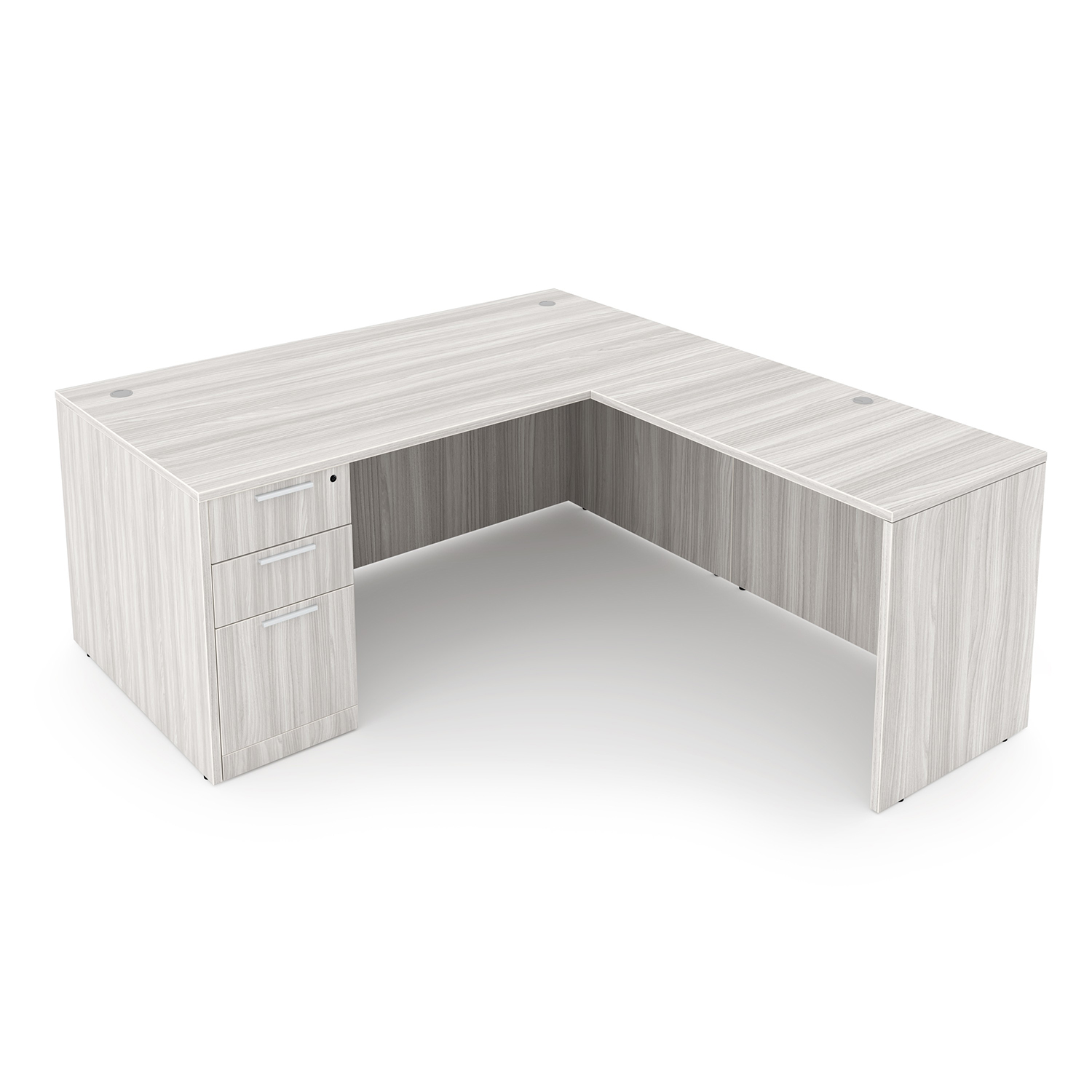 The i5 Industries Rayne Modern L-Shaped Pedestal Desk with Single Full Pedestal is 71″ x 78″ and can adjust to left or right-handed configurations. Multiple L-Shaped desks can combine together for a larger workstation. There are two box drawers and one file drawer that are soft close with 6″ L-shaped handles secured by removable locking cores for easy rekeying. Uneven floors are no longer a problem with adjustable levelers up to 1″. Attractive laminate finish that is commercial grade and made to withstand heavy use while looking great in your high-traffic areas.