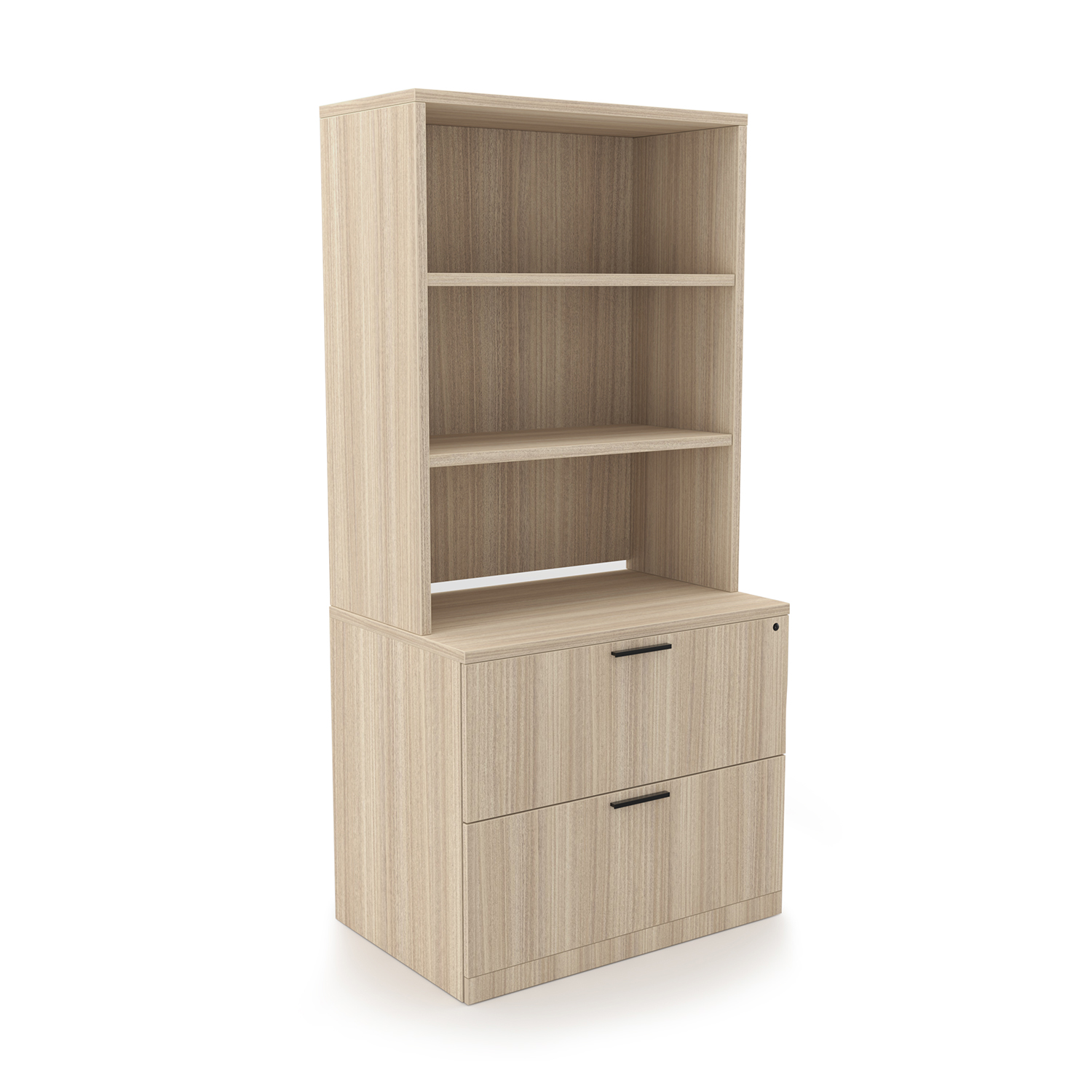 The i5 Industries Rayne laminate Open Hutch Lateral File is 36″ wide and stands 6 feet tall. Composed of a bookcase hutch with two adjustable shelves and a lateral file with two lockable drawers. All drawers are soft close with a removable lock core for easy rekeying. Drawers open fully and utilize side-to-side filing. Matching components are available.