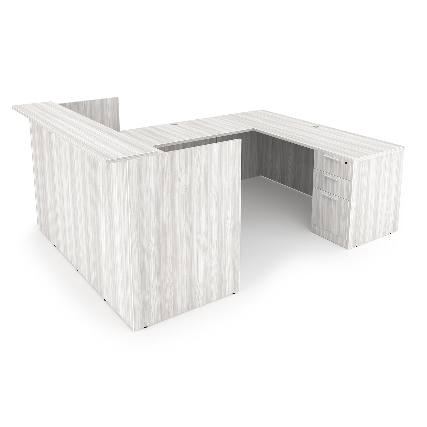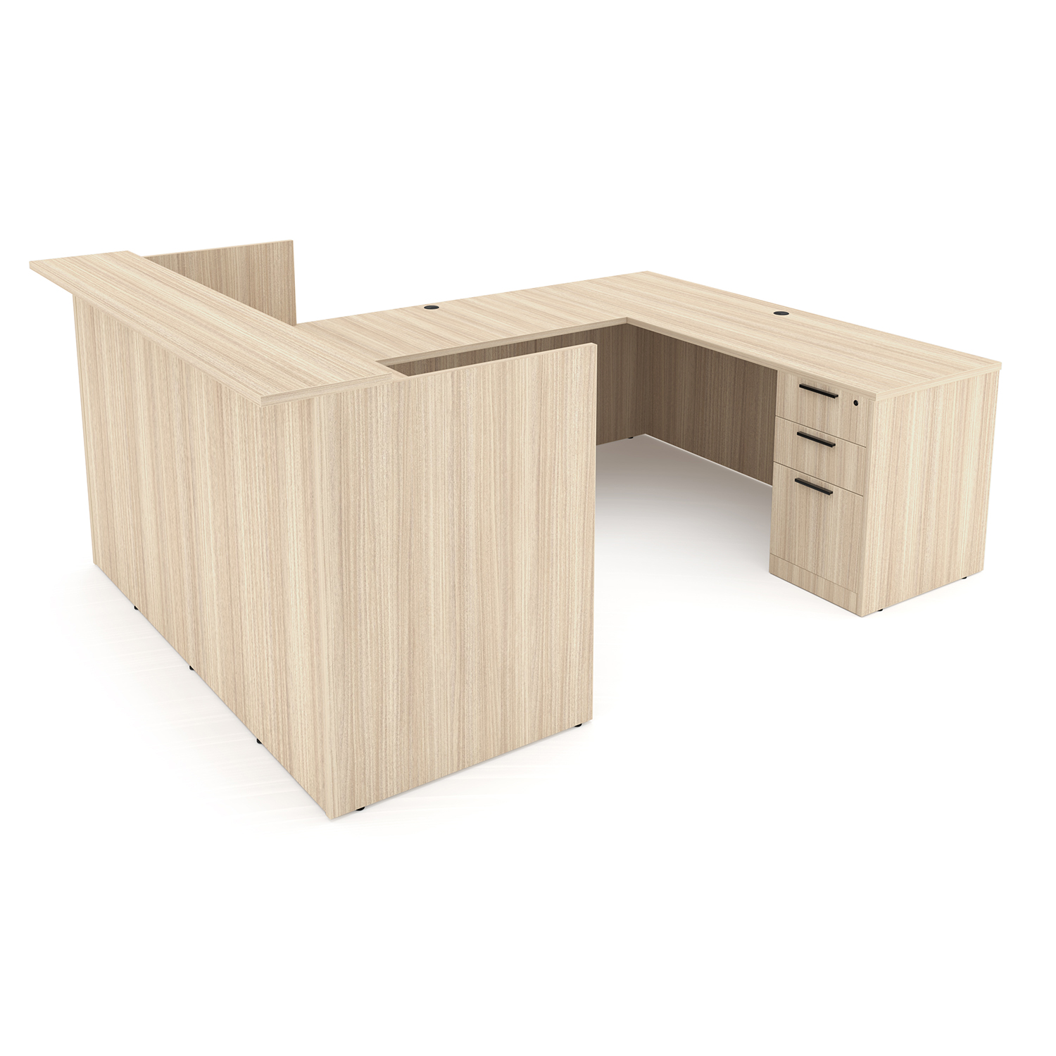 The i5 Industries Rayne Modern U-Shaped Reception Pedestal Desk is 71″ x 72″ and can adjust to left or right-handed configurations. Multiple U-Shaped reception desks can combine together for a larger reception station. Features a rectangular transaction counter that is 14″ deep and 71″ wide. There are five drawers that are soft close with 6″ L-shaped handles secured by removable locking cores for easy rekeying. Uneven floors are no longer a problem with adjustable levelers up to 1″. Attractive laminate finish that is commercial grade and made to withstand heavy use while looking great in your high-traffic areas.