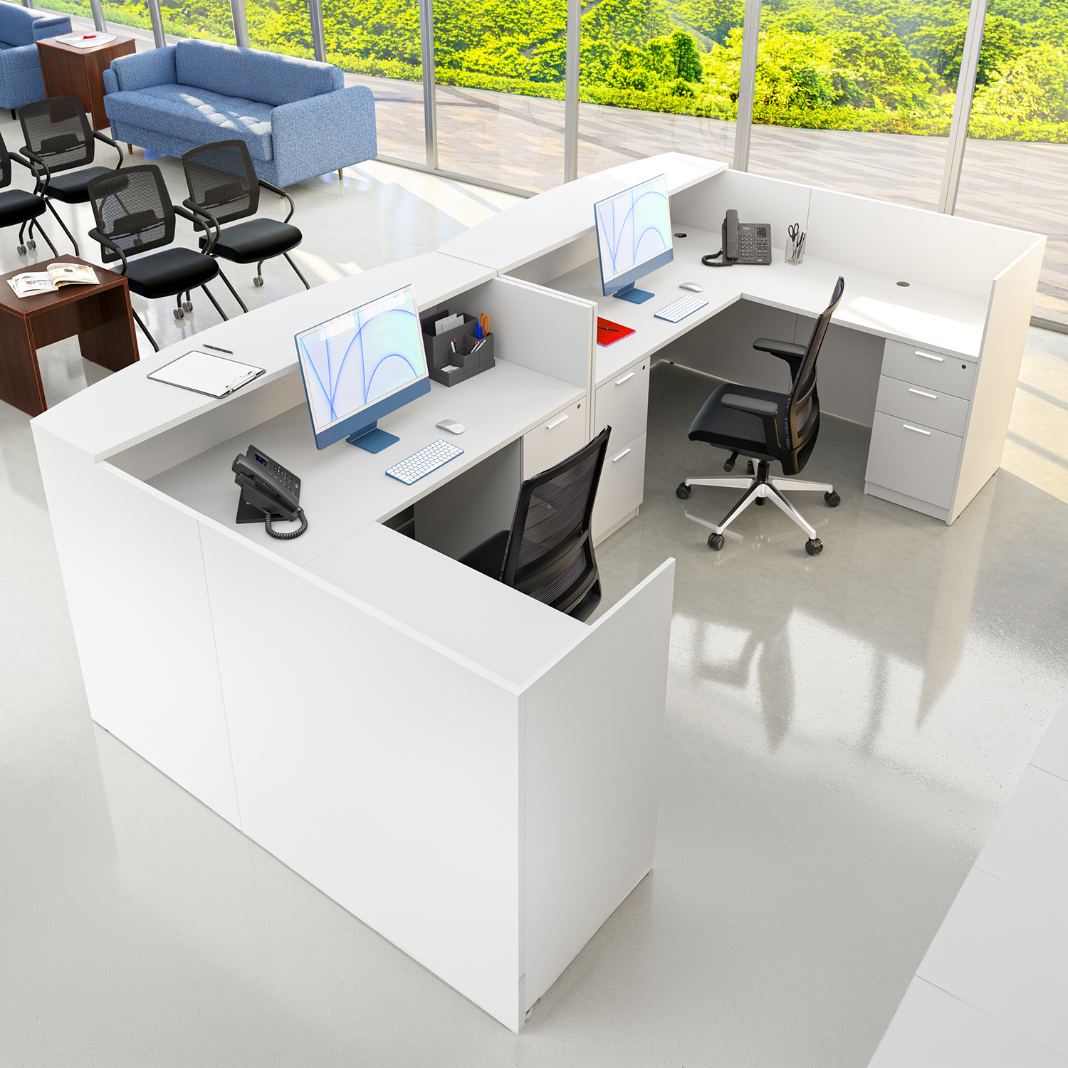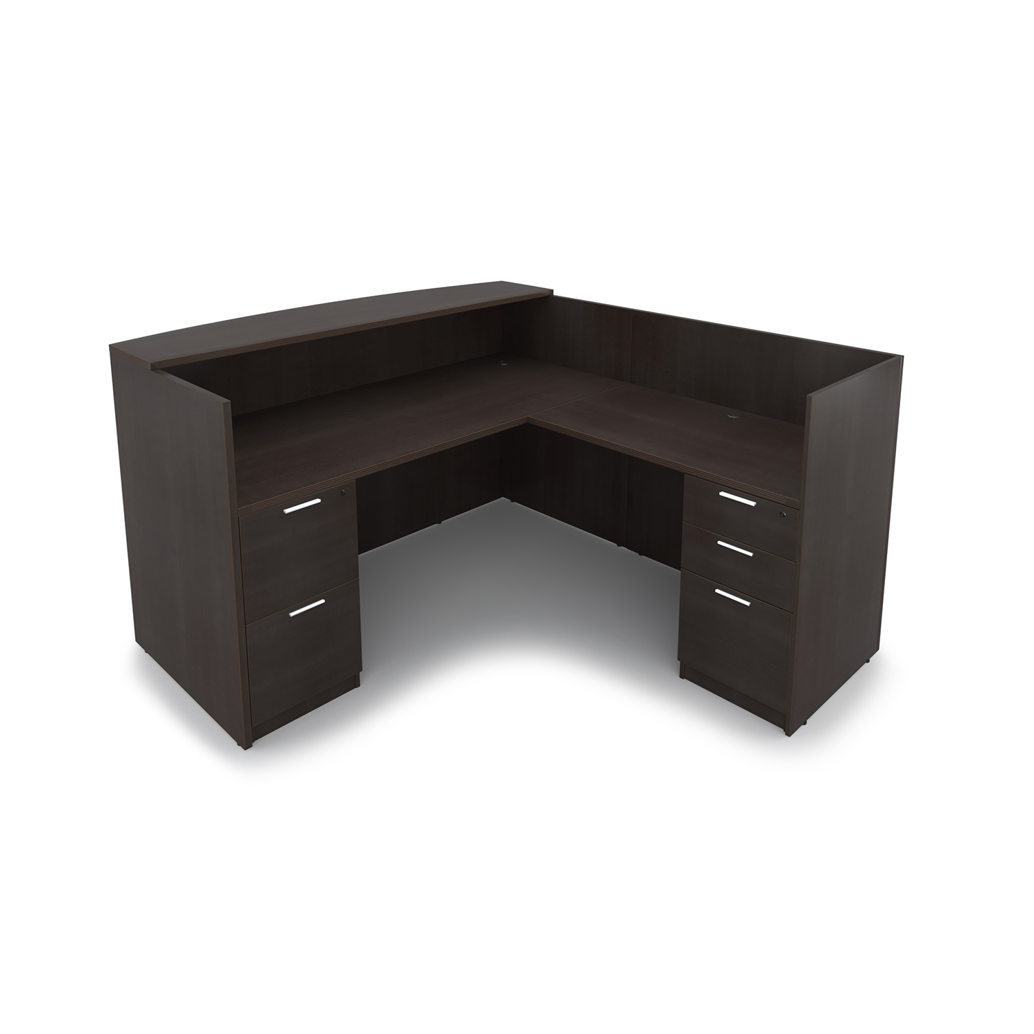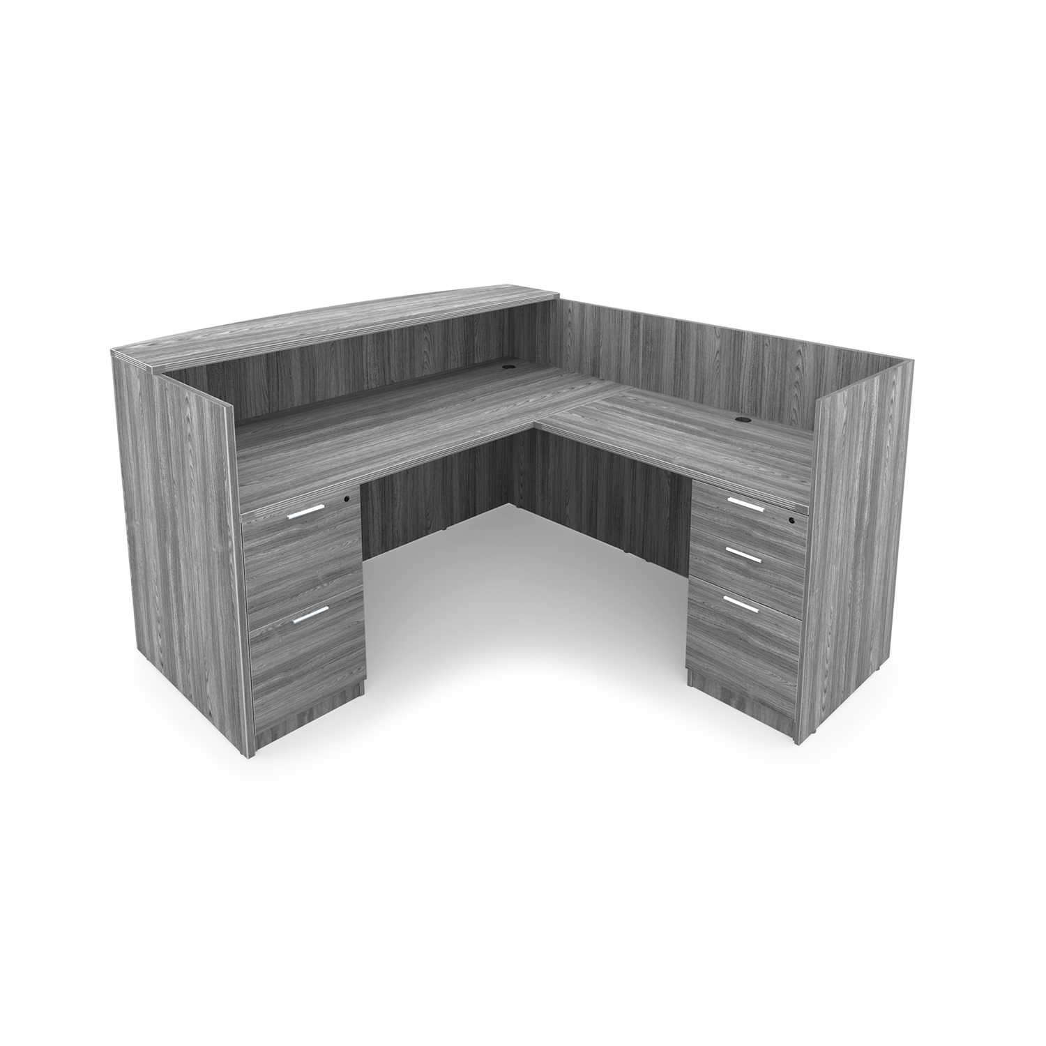 The i5 Industries Kai Modern L-Shaped Reception Pedestal Desk is 71″ x 72″ and can adjust to left or right-handed configurations. Multiple L-Shaped reception desks can combine together for a larger reception station. Interact with patrons over the 42″ tall countertop that is fluted with an attractive 3mm edge banding and curved front that is 17.5″ at the deepest point and tapers down to 12.5″ on the edges for an attractive look. Under desk storage includes a combined total of three file drawers and two box drawers with keyhole shaped handles within hand’s reach to assist patrons at a moment’s notice. Attractive laminate finish that is commercial grade and made to withstand heavy use while looking great in your high-traffic areas.