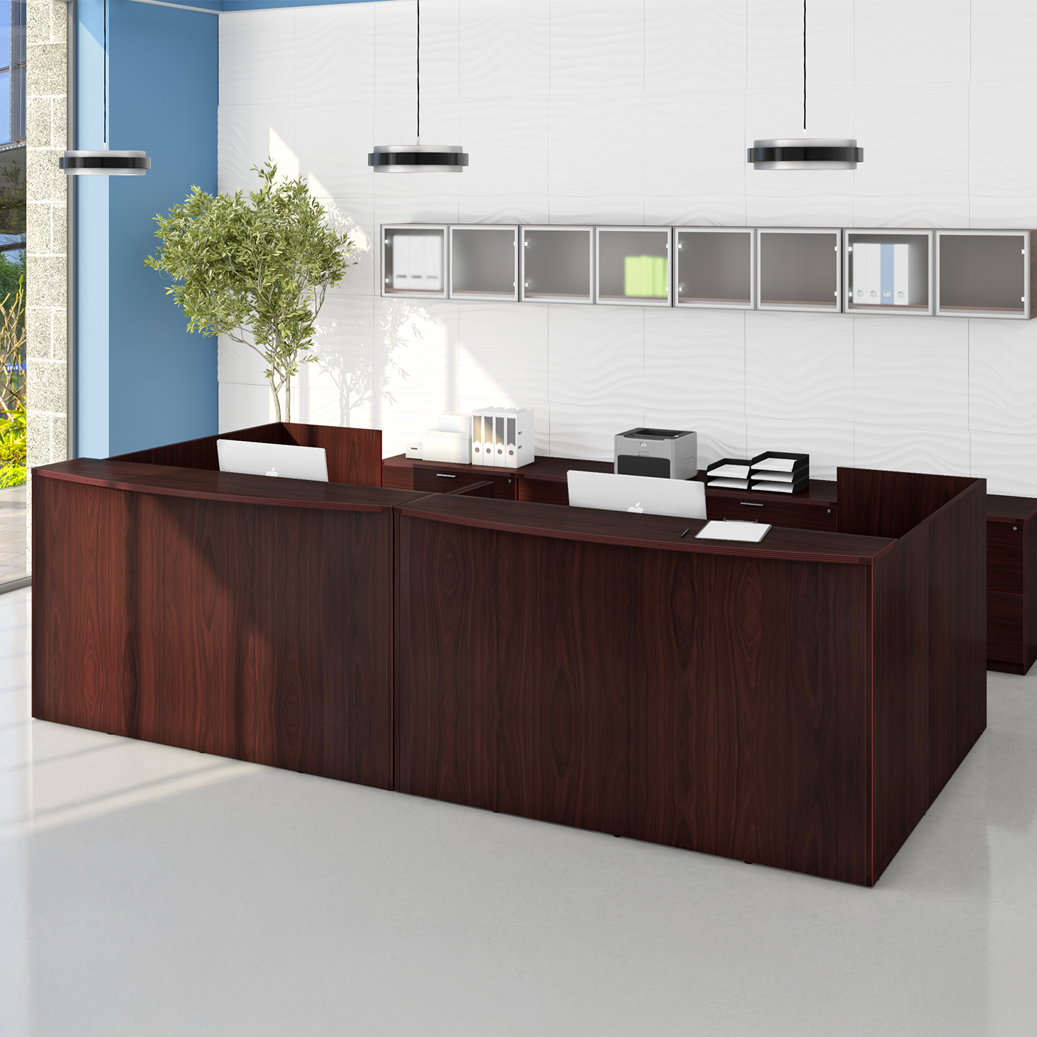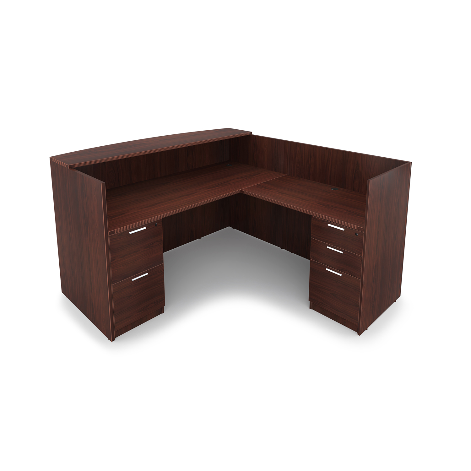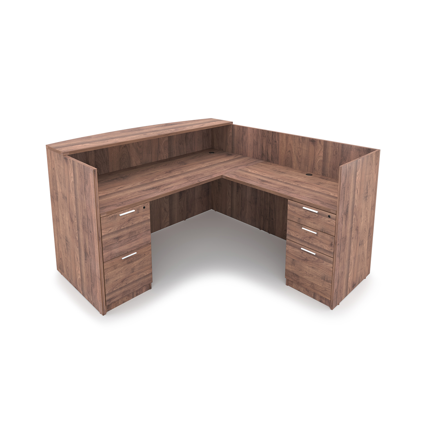 The i5 Industries Kai Modern L-Shaped Reception Pedestal Desk is 71″ x 72″ and can adjust to left or right-handed configurations. Multiple L-Shaped reception desks can combine together for a larger reception station. Interact with patrons over the 42″ tall countertop that is fluted with an attractive 3mm edge banding and curved front that is 17.5″ at the deepest point and tapers down to 12.5″ on the edges for an attractive look. Under desk storage includes a combined total of three file drawers and two box drawers with keyhole shaped handles within hand’s reach to assist patrons at a moment’s notice. Attractive laminate finish that is commercial grade and made to withstand heavy use while looking great in your high-traffic areas.
